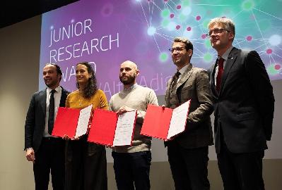 Die Preisträger des Junior Research Award Südtirol 2025 Marco Prina, Magdalena Nagler Jack Schropp wurden für ihre hervorragende Arbeit als Nachwuchswissenschaftler:innen ausgezeichnet.